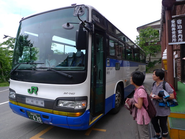 這輛JR巴士和JR新幹線E5列車 一樣是漂亮的「常盤綠」,我們跟著它前往民宿,今天早上差一點搭錯的那班車就是開往這個方向的,「奧入瀨溪,拜拜囉!」
