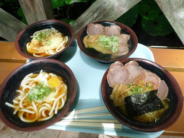 取餐之後,到另一間休憩木屋用餐,以份量來說,拉麵比烏龍麵多很多;以味道來說,天婦羅烏龍最優,撒上「蒜香七味粉」提味更好吃。