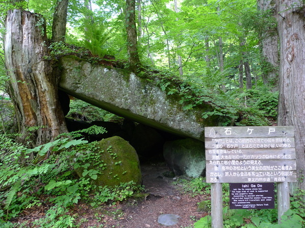 「石ヶ戶」是岩屋的意思,大樹幹撐起這塊厚達一公尺的石頭,這個結構就是「石ヶ戶」,據說裡面住著一位專門打劫路人財物的美女強盜,遊客請自行小心了!
