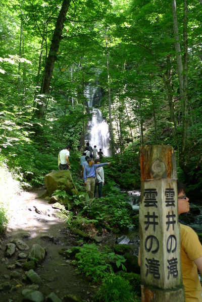「雲井之滝」在馬路的另一邊,必須離開步道,走一小段溼滑的山路,遊客很多。
