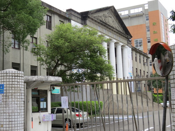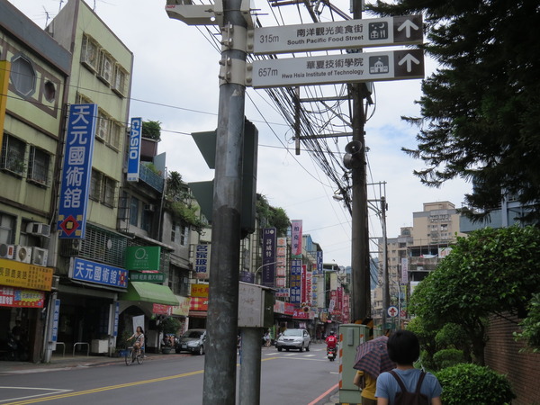過了美食街之後,遇十字路口,直行「華新街109巷」,經過「華夏技術學院」側門,望見希臘神殿式的大建築物。