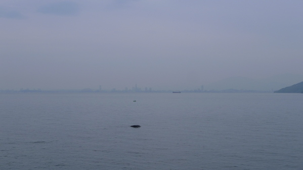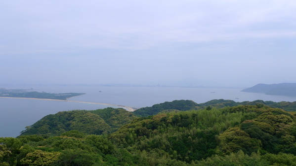 隔著「博多灣」,眺望福岡塔和巨蛋。雖然能見度不佳,梅雨季沒再下雨我們已是感激不盡。