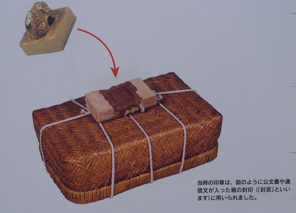 機密性公文或信件的外盒綁上繩子,在打結處封上黏土,然後在黏土上蓋上金印,確保文件的機密性。