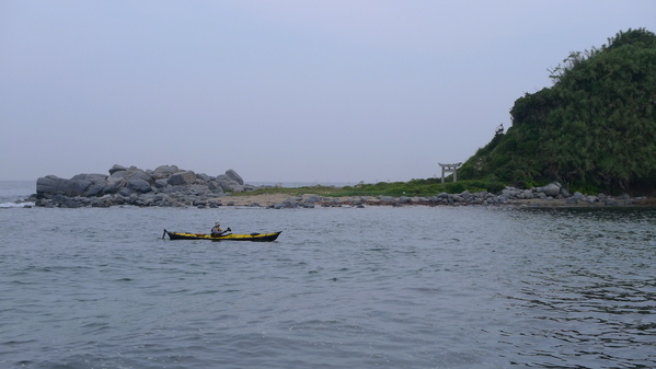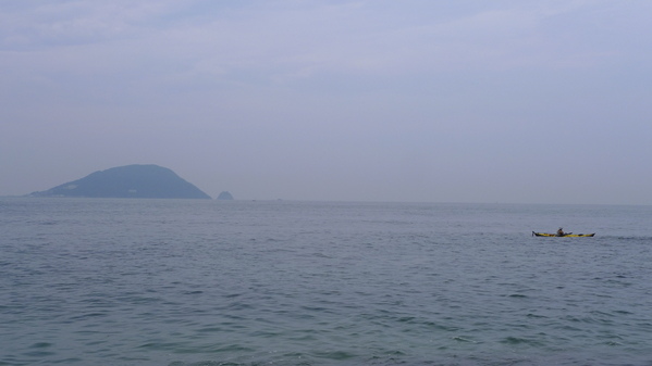 「玄界灘」上的島嶼海景,海面上有人悠閒地划著獨木舟。