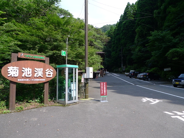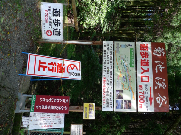 決定放棄之後,繼續沿著「45號道」向西,開了一段路,路邊的「中央停車場」看到大大的牌子~「菊池溪谷遊步道入口700m」,皇天不負有心人,最後還是讓我們找到了。