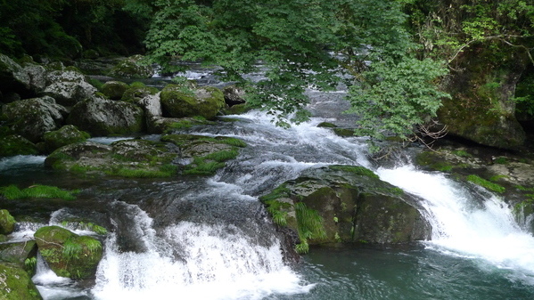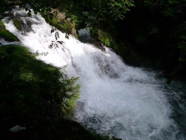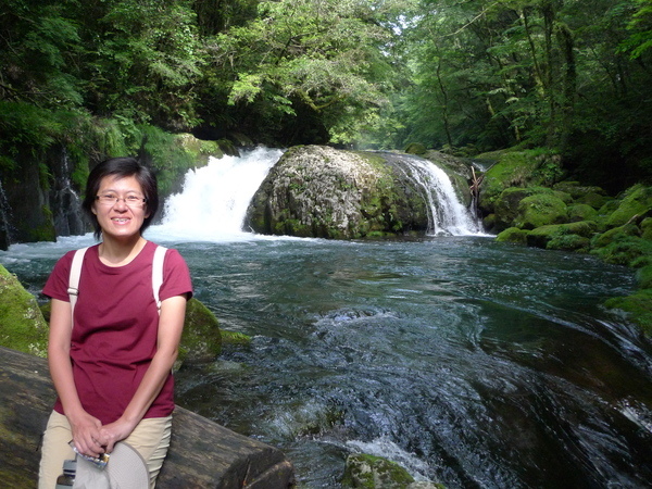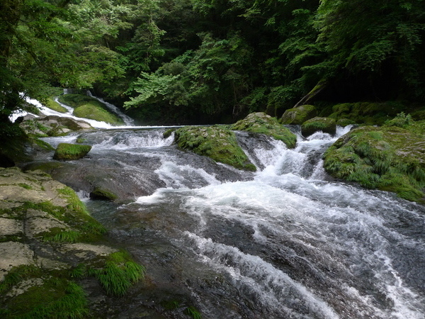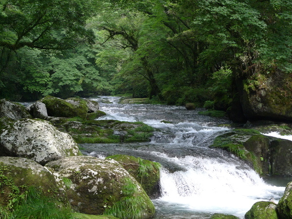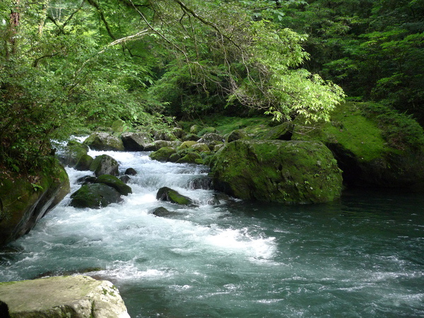 陽光從樹葉縫隙中灑下,白色水花配上青苔怪石,打上綠色光影,是「菊池溪谷」的經典畫面。