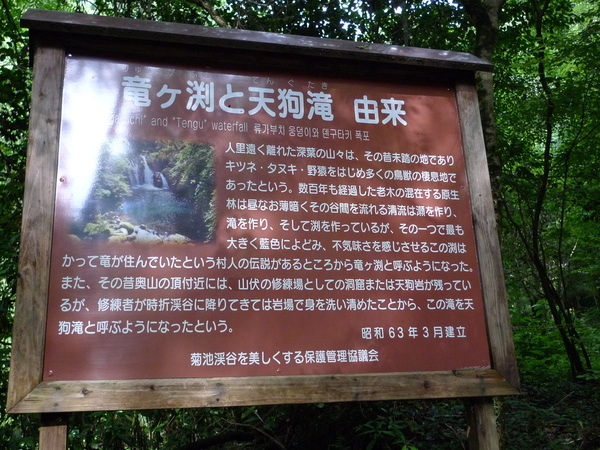 「龍淵」與「天狗瀑布」~從前這裡是猿猴鳥獸的棲息地,旁邊有一顆天狗岩和洞窟,傳說曾經有龍住在水中,有天狗在旁邊的洞穴中修煉,因此取名為「龍淵」與「天狗瀑布」。