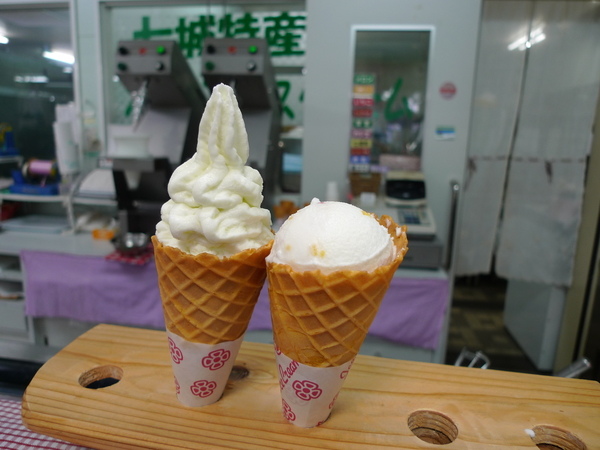 「青肉哈密瓜霜淇淋(350円)」和「赤肉哈密瓜冰淇淋(200円)」,霜淇淋是用新鮮水果現打的,沒吃過這麼好吃的霜淇淋,好想再飛過去七城吃一枝!