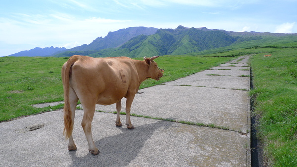 走在草原中,「杵島岳(右)」和「烏帽子岳(左)」始終陪在身邊,來九州那麼多天,終於看到藍天白雲了,心情特好!
