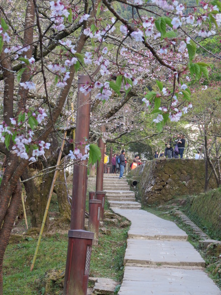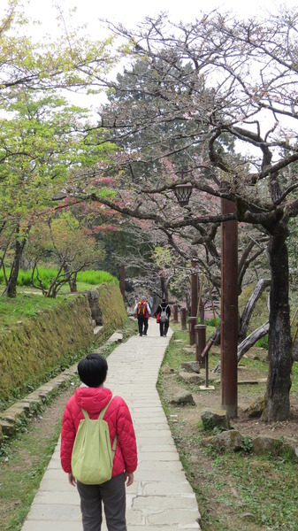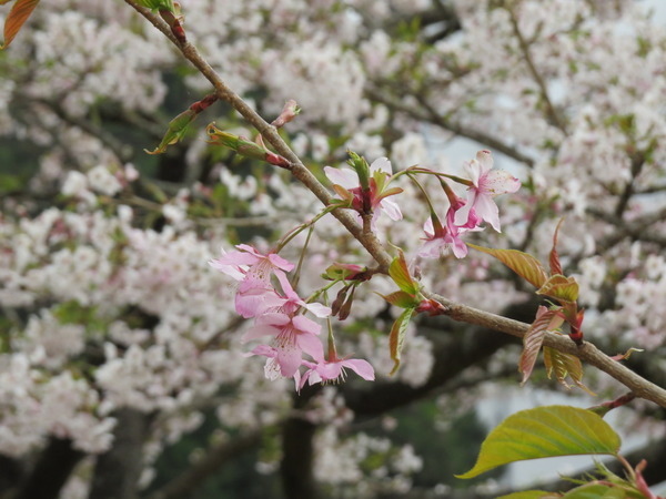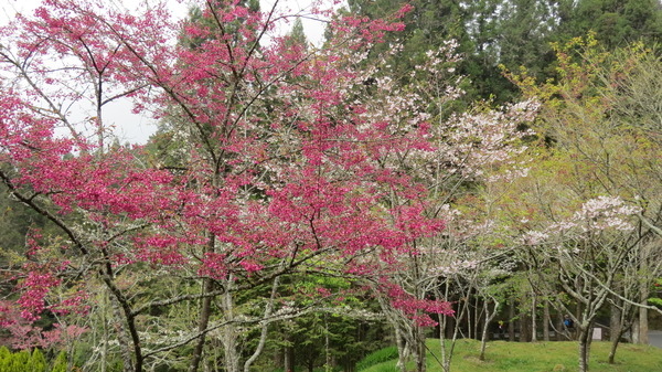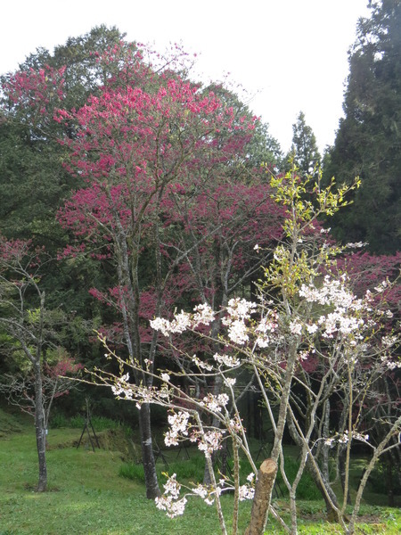 後面一小片粉紅色櫻花林,已經冒出新葉。