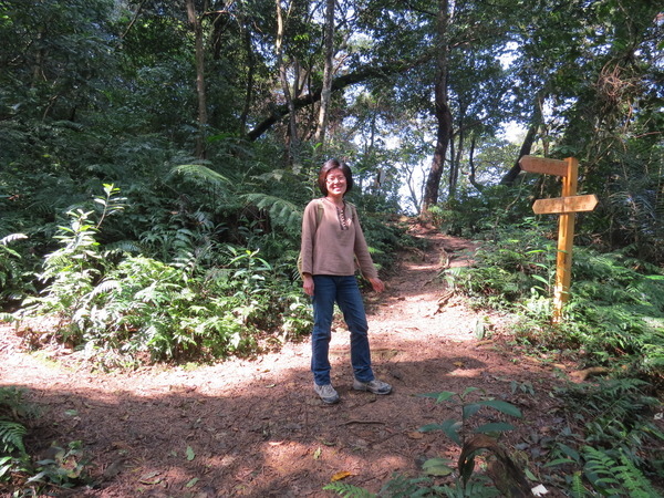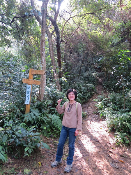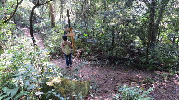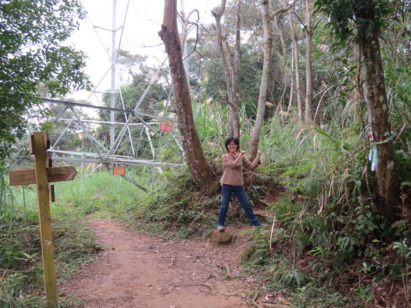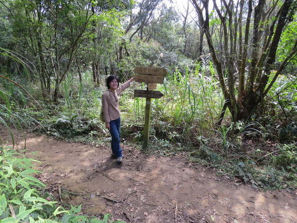往上約十公尺就是「時鐘尾仔」岔路,這裡的指標是對的,往「山頂」方向走去。
