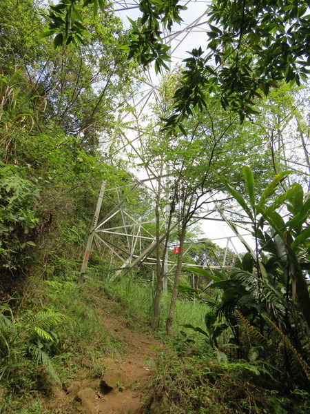往前走一分鐘就遇到岔路,右邊有一座大電塔。