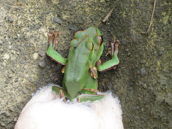 下山回程時,再度經過蓄水池,發現母蛙離開了原來休息浮葉,攀著一根樹枝幾乎就要翻肚,但是雄蛙還是緊緊黏在母蛙背上不肯放開,母蛙要負責產卵還要負責照顧公蛙,真是辛苦!