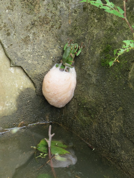 下面較大的是雌蛙,上面較小的是雄蛙,雄蛙會夾著雌蛙的肚子幫助排卵,排卵之後,隔一段時間雌蛙會踩一踩下面的卵塊,好像在打奶泡一樣。(可參看交配與產卵,比較了解整個過程)