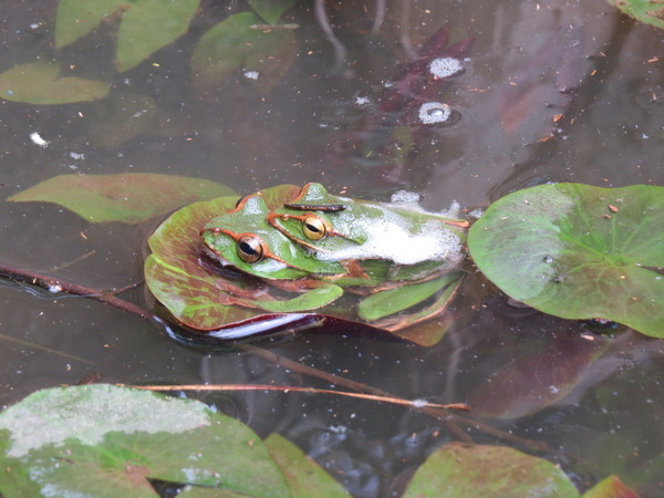 電塔旁一口小小的方形蓄水池,兩隻樹蛙正在努力創造宇宙繼起的生命。