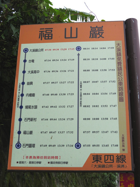 大溪免費公車「福山巖」站、桃園客運「溪洲」站就在登山口旁,再旁邊就是「康莊路五段529巷」登山口,兩處登山口相距只有10公尺左右。