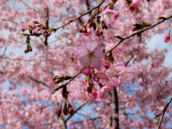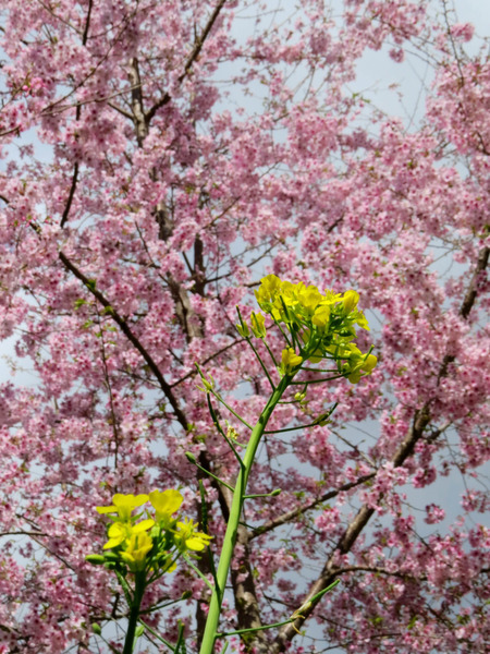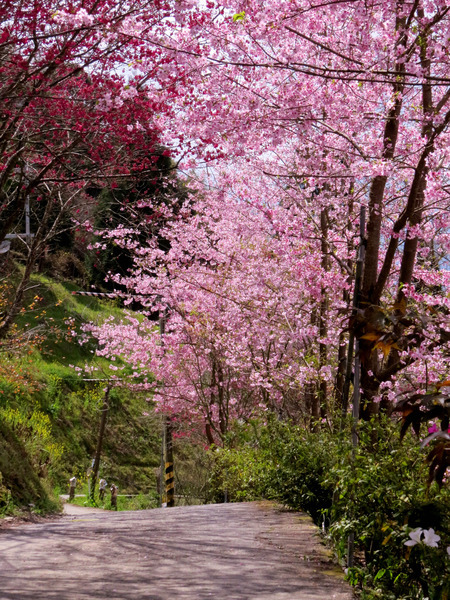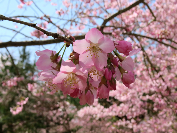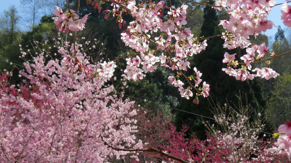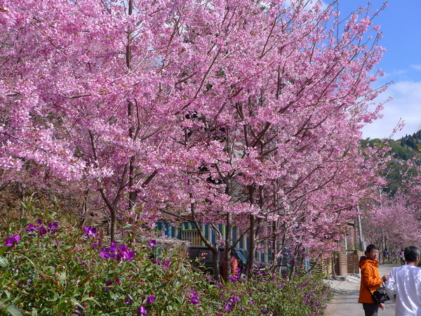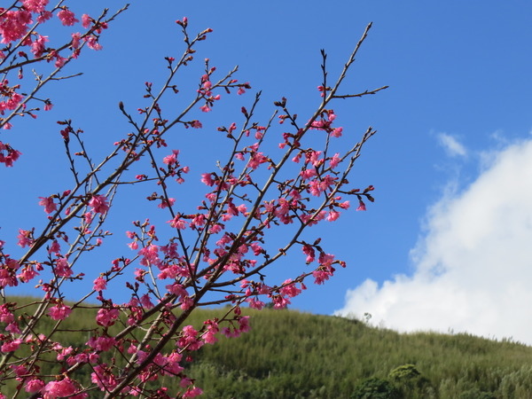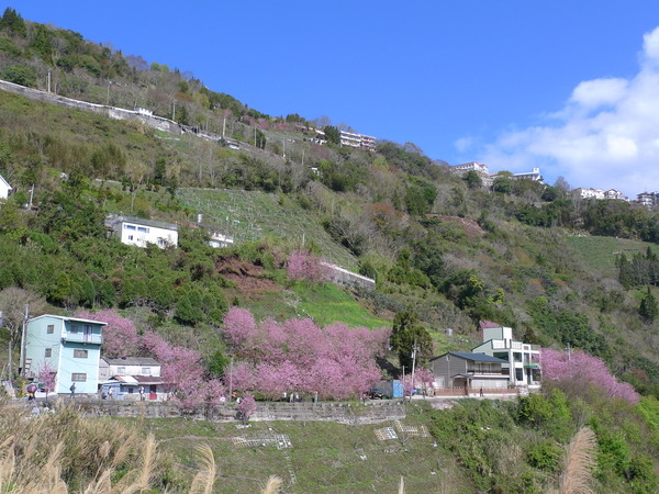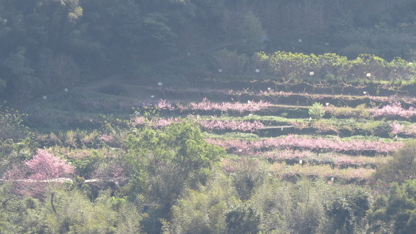 越往北橫前進,陽光越燦爛,在河的對岸見到一片粉紅色的花,左下較高的一棵肯定是櫻花樹,一排排較矮的是什麼呢?
