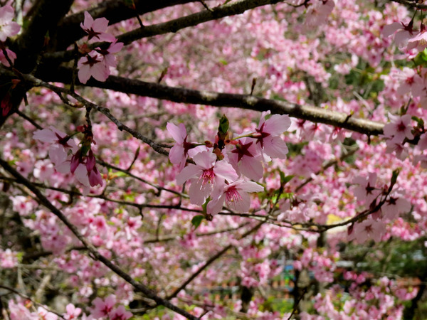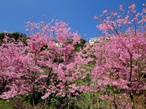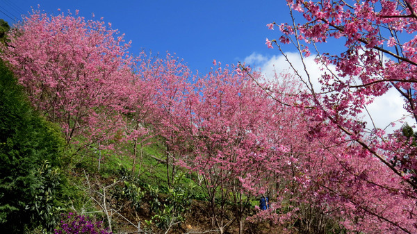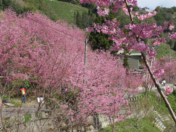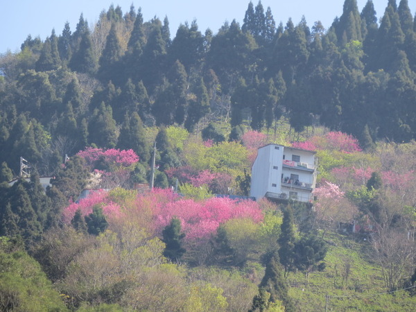 收費亭後方山頭可以見到密集而盛開的粉紅色櫻花,真令人興奮。
