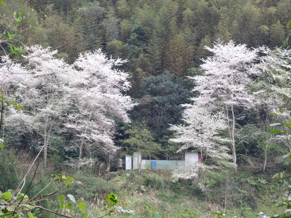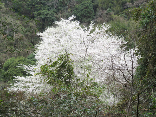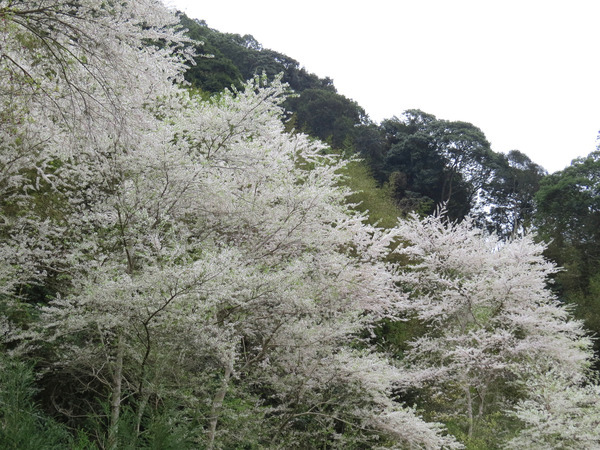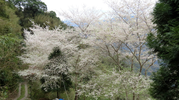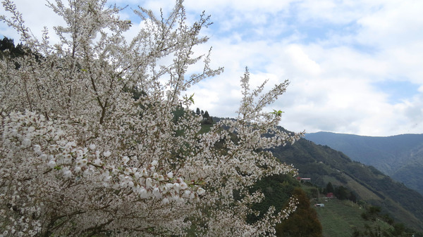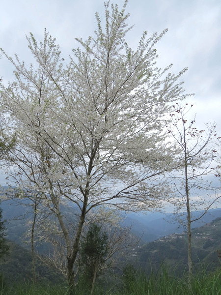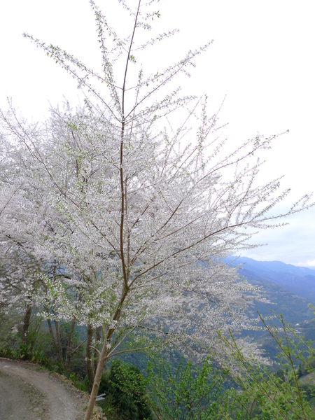 網路上Google之後查到資料,這櫻花稱作「霧社白櫻」,為台灣特有原生種野生白櫻,早年從霧社至廬山地區遍地都是,因日本人統治台灣時大量引進緋寒櫻栽種,並將原來的原生野生櫻花砍伐殆盡,所以「霧社白櫻」已成山區少數碩果僅存的稀有花種。