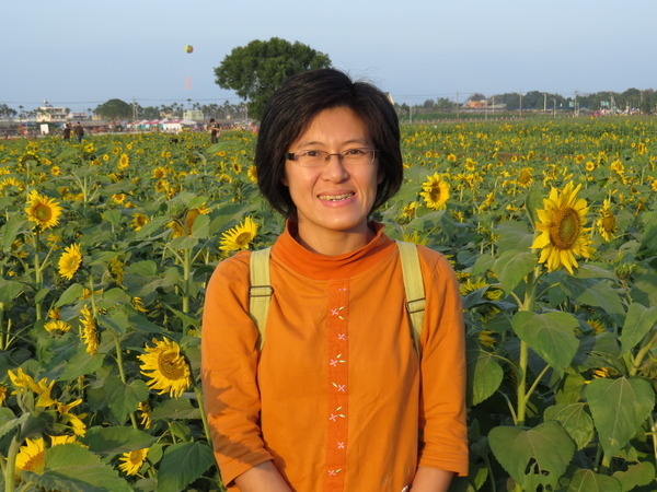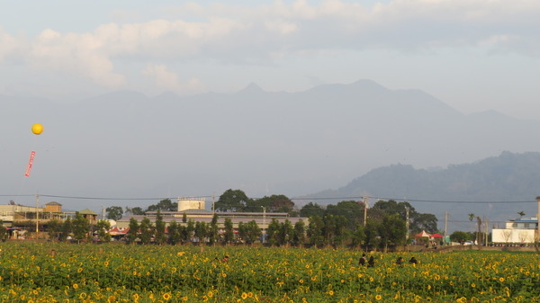 遠處山脈中,尖尖凸起的應該就是「鳶嘴山」,我們明天要前往登山賞楓紅。眼前的向日葵田中,遊人穿梭其間拍照