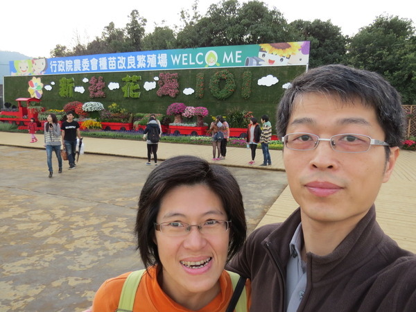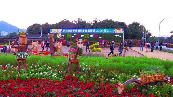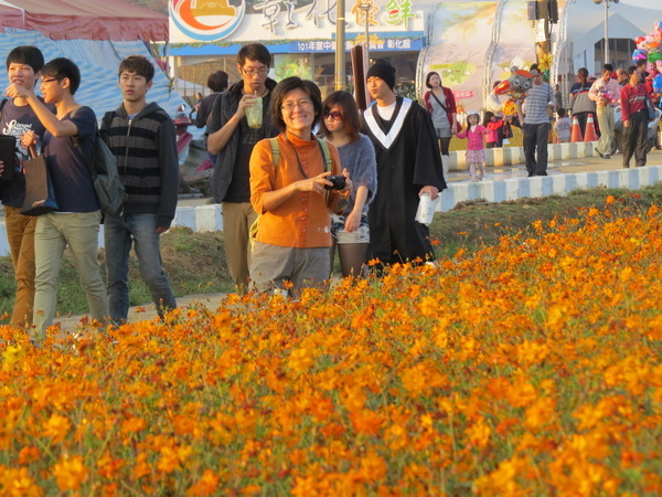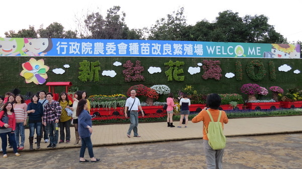 旁邊有「新社花海101」的字樣,合影留念的人潮眾多。