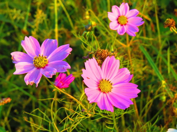 十二月中旬,大波斯菊幾乎凋謝光了,找到三朵比較完整的,在夕陽的光照下使用「極鮮豔」模式,花朵的色澤似乎太過頭。