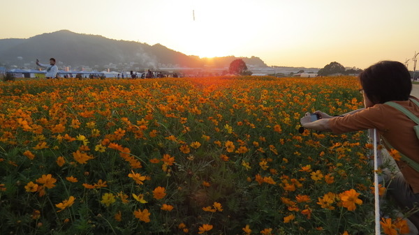 太陽快西下了,逆光拍攝另一片黃波斯菊。(遠處人潮聚集,怎麼回事??)
