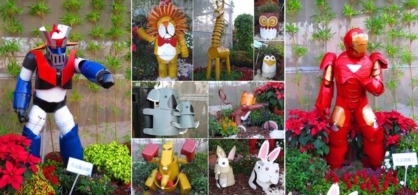 用花盆、水桶等園藝工具組合成各式各樣的造型,栩栩如生,好可愛!