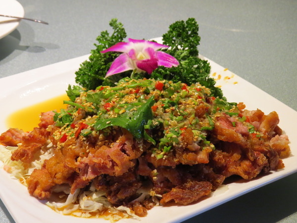 菜單上原本是「酸甜里肌」,我們加了80元換成這一道。吃到盤子快要見底時,老公不知和服務生嘀咕些什麼,服務生不斷道歉,接著來了一位年紀較長的小姐說要換一盤給我們,大家非常好奇為什麼要換一盤?原來是老公吃到了鐵刷屑,所以我們連吃了兩盤涼拌花枝,都吃光光。