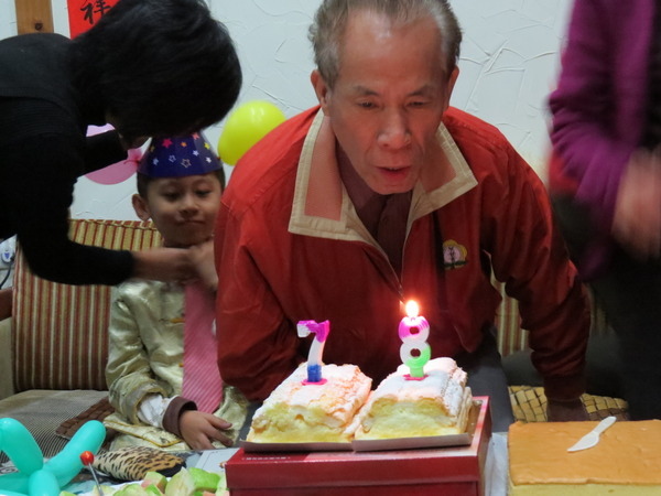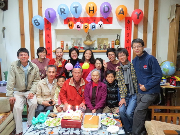 母親帶著大家舉杯祝福老爹:「福如東海,壽比南山」、「越來愈健康,越來越有魅力,越來越帥,越來越聰明.......」,越講越離譜,我們這一家子不胡鬧一下是不可能的!