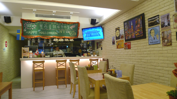 淺色木桌、布椅,小小店家有溫馨家庭風,牆上掛著很多外國照片海報,放著英文歌曲,電視播放著運動比賽的頻道,果然有美式風格。