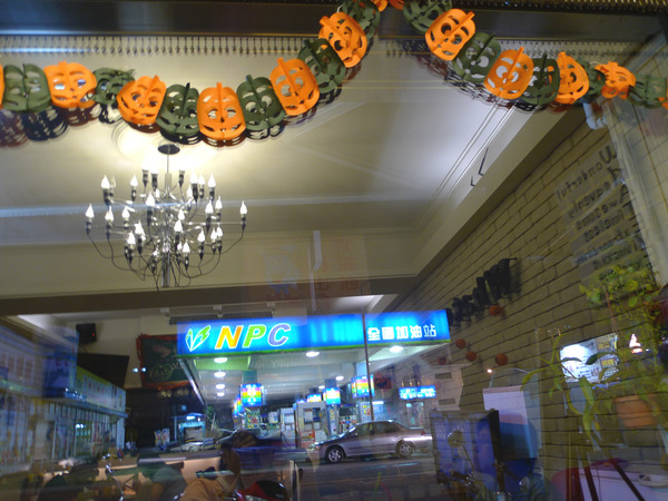 萬聖節剛結束,南瓜裝飾處處可見,我們坐在窗邊的四人桌,對面就是全國加油站!