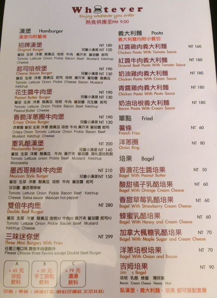 義大利麵有奶油培根、青醬雞肉、紅醬牛肉或雞肉四種選擇,詢問之後只有紅醬沒有奶味,等會兒漢堡就有牛肉,所以點了~