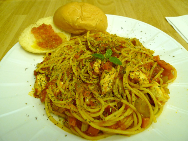 上面撒了超多的香料,賣相真的很抱歉,攪拌之後一嚐~真好吃,不同於一般味道很濃的番茄肉醬,這裡的紅醬是用新鮮的番茄製作的,吃得到番茄丁,味道清爽卻又不會過淡,盤邊附上麵包,抹上的蕃茄醬料,若能烤熱會比較好。