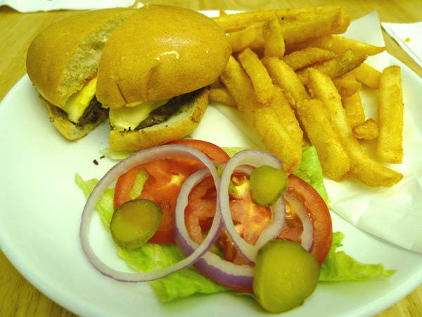 漢堡都附薯條,裹粉炸過的,份量不少,桌上一大罐番茄醬隨自己加,很過癮,但是吃到後來有一點太乾燥。