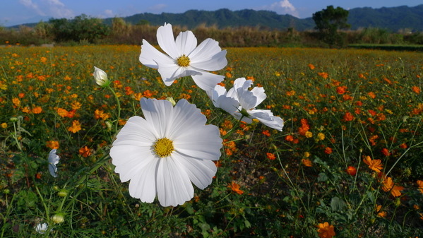 其中一株白色波斯菊「鶴立『橘』群」,分外醒目。