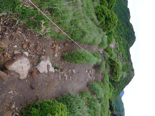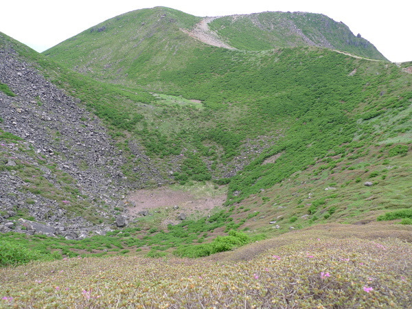 我們腰繞經過「天狗ケ城」,前方的大山才是「中岳」,下方沒水的窪地叫做「空池」,腳邊整片的霧島杜鵑已經凋謝光了。