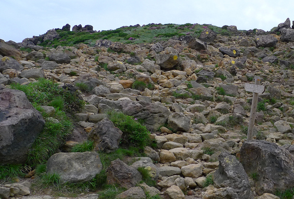 「星生崎」之後,開始穿梭在大型石塊上,風景很單調,跟著點黃漆的石頭走就對了。