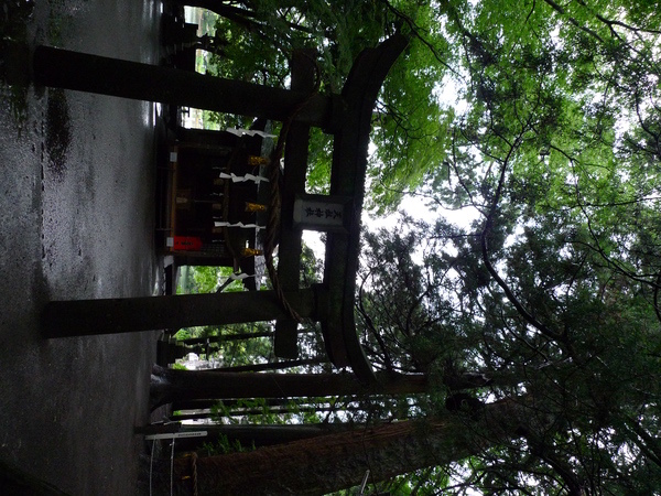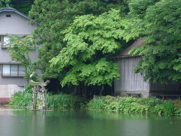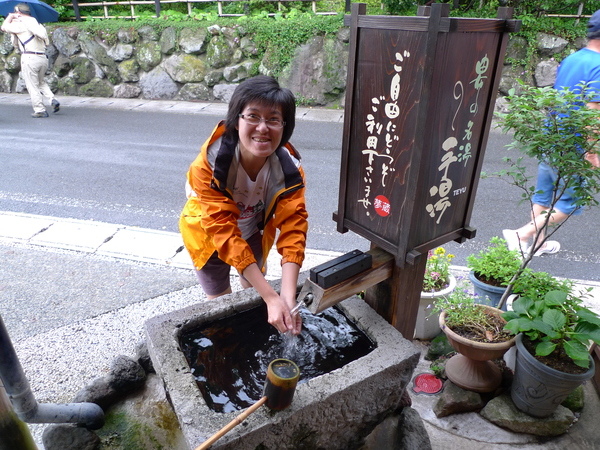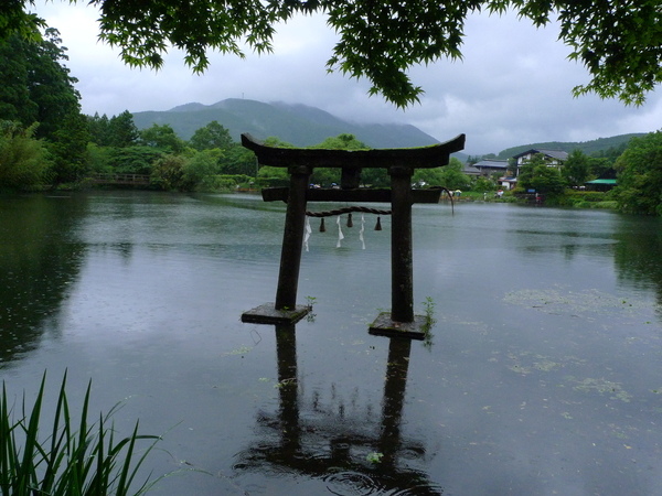 坐在神社後面躲雨,欣賞著水中鳥居、雨中的金鱗湖、雲霧縹緲的山巒。