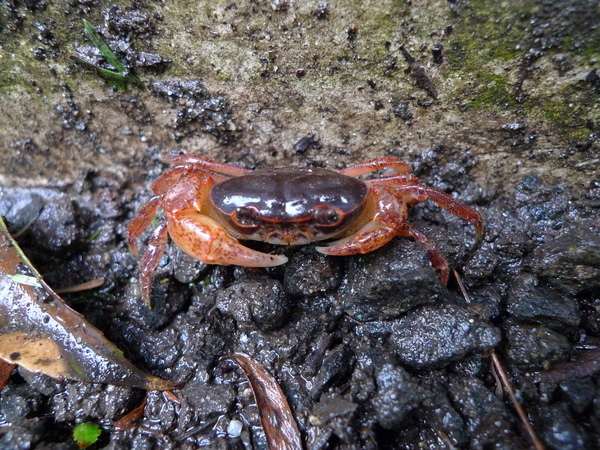 一隻螃蟹從腳邊橫行而過,完全不怕人。