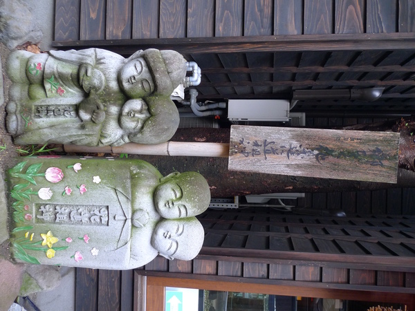 溫泉這一側很多手打蕎麥麵店,這家「泉 蕎麥」門口是有長睫毛和大胸部的女河童哦!