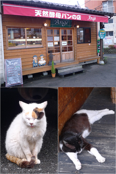 雖然剛吃飽,仍忍不住跟著別人進了這家麵包店,門口好多隻可愛喵。