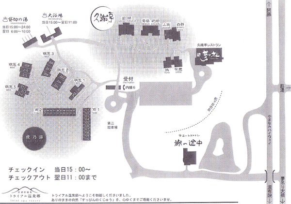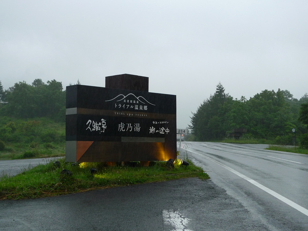 跟著指標往前不遠右轉上坡,長者原溫泉區的「Trial Spa Resort虎之湯」就位在空曠的高台上,視野應該很棒,可惜現在煙雨濛濛。