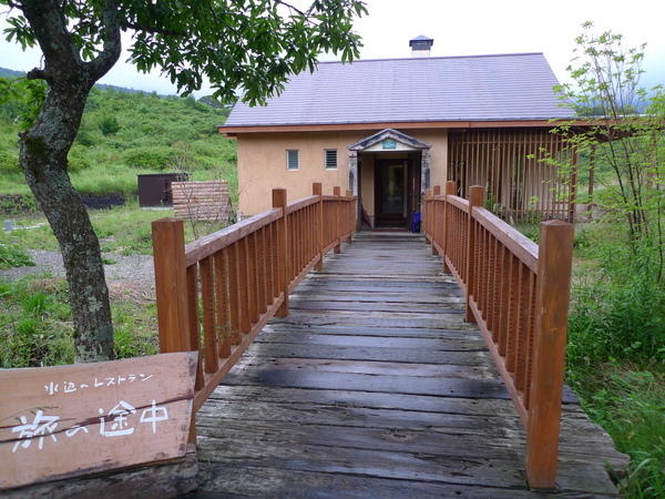 走沒多遠,溫馨的「水邊餐廳~旅之途中」就到了,喜歡這個環境,喜歡這個店名,喜歡這個設計,跨過木橋,興奮中......