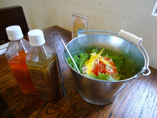 首先,送上一鐵桶的生菜沙拉,還附上兩大瓶沙拉醬隨便我們加,實在非常夠意思。