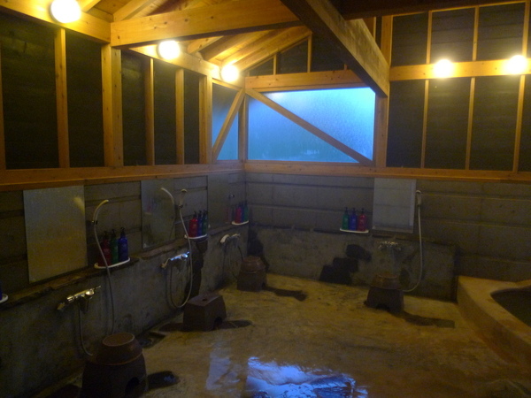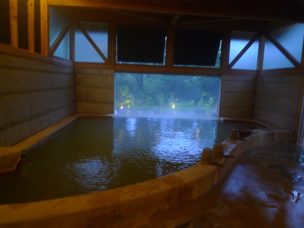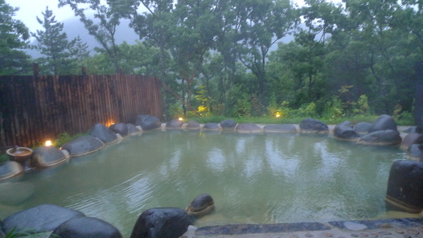 整個女湯只有她一人,室內池太悶,泡沒多久就暈了,所以換泡室外池,溫度剛剛好,泡得正舒服時,卻聽到烏漆嘛黑中,呼呼的風雨聲不絕於耳,張開眼,又看見樹影被強風吹得張牙舞爪,越泡越覺得冷,心裡越來越毛,好像會見到不該見到的東西,所以趕快換到室內池,沒想到進了密閉昏暗的室內池還是覺得全身不對勁,只好起身更衣,不甘不願地到門口等待,無聊中發現工作人員巡得很勤,衛生維護得很好,還想買他們腳上洗溫泉池專用的雨鞋來穿,真是服了她了。