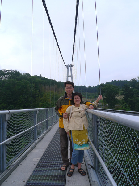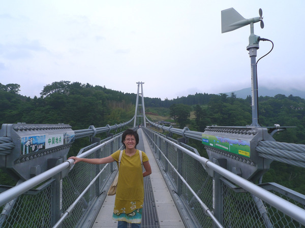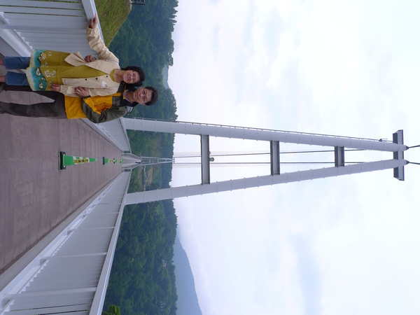 雖然吊橋建得很穩,橋幅1.5公尺頗寬,走起來仍有搖晃的感覺,加上看著橋好長,谷好深,小姐怕怕,要拉著鐵索慢慢前進才行。