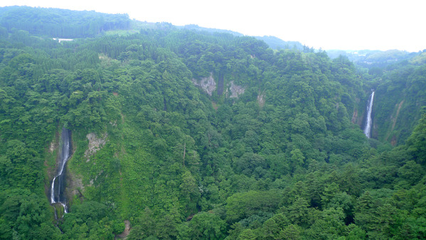 左側是落差98公尺的「女滝」,中間的「子滝」因水量太小幾乎看不見,最右側是落差83公尺的「男滝」,隆隆的水聲果真震動整座山谷,所以稱為「震動之滝」,名列日本「百大名瀑」之一。