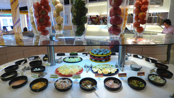 換個角度,前方是多種醬料,右排是涼拌沙拉與水果,左排是生菜沙拉與抹茶凍。