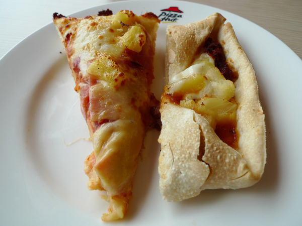 拿一塊還沒吃過的「日式燒牛肉捲餅」,再加一片最愛的「夏威夷比薩」,吃完之後連我也投降了!